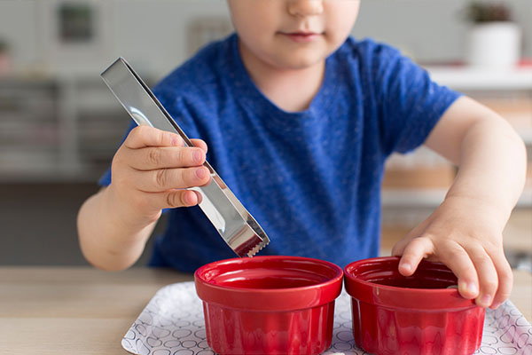 - Invitez votre enfant à transférer des objets d’un contenant à l’autre avec les doigts, des pinces ou des cuillères.